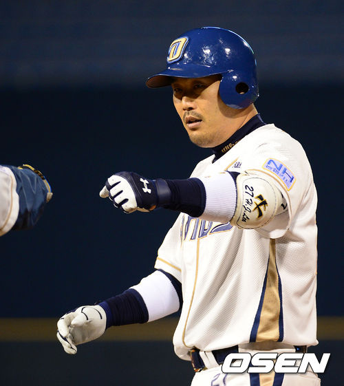 30일 오후 창원 마산구장에서 열린 '2013 한국야쿠르트 세븐 프로야구' NC 다이노스와 LG 트윈스의 경기, 6회말 1사 2,3루에서 NC 이호준이 동점 1타점 적시타를 날리고 기뻐하고 있다.