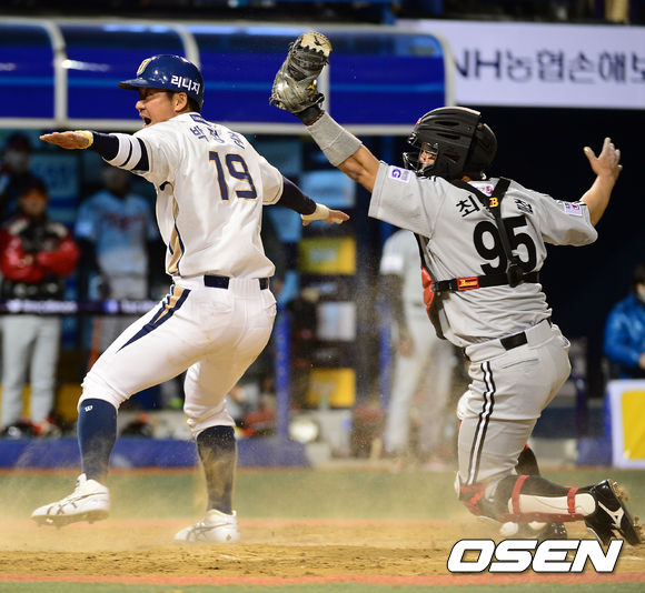 30일 오후 창원 마산구장에서 열린 '2013 한국야쿠르트 세븐 프로야구' NC 다이노스와 LG 트윈스의 경기, 6회말 1사 1,3루에서 NC 박정준이 권희동의 외야플라이에 홈에서 LG 최경철의 태그에 앞서 세이프되고 있다.