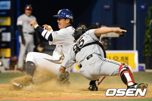 30일 오후 창원 마산구장에서 열린 '2013 한국야쿠르트 세븐 프로야구' NC 다이노스와 LG 트윈스의 경기, 6회말 1사 1,3루에서 NC 박정준이 권희동의 외야플라이에 홈에서 LG 최경철의 태그에 앞서 세이프되고 있다.