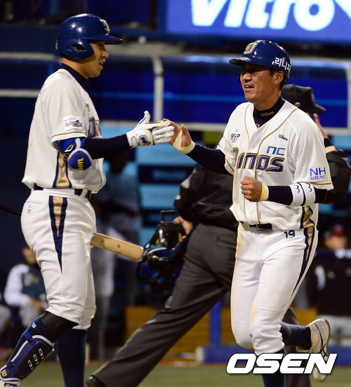 30일 오후 창원 마산구장에서 열린 '2013 한국야쿠르트 세븐 프로야구' NC 다이노스와 LG 트윈스의 경기, 6회말 1사 1,3루에서 NC 박정준이 권희동의 외야플라이에 홈에서 LG 최경철의 태그에 앞서 홈을 밟고 조영훈과 하이파이브를 하고 있다.