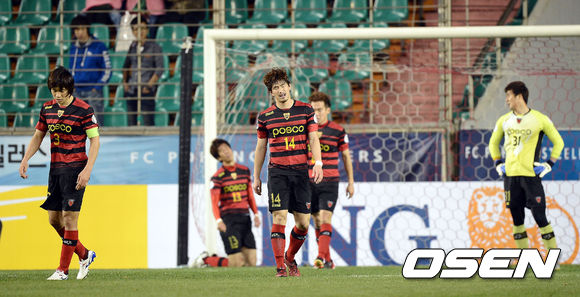30일 오후 포항 스틸야드에서 열린 2013 아시아축구연맹(AFC) 챔피언스리그 G조 6차전 포항 스틸러스와 분요드코르의 경기, 후반 포항 선수들이 실점을 하자 아쉬운 표정을 짓고 있다.