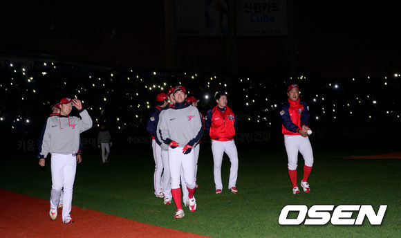30일 오후 서울 잠실구장에서 열린 '2013 한국야쿠르트 세븐 프로야구' 두산 베어스와 KIA 타이거즈의 경기 5회말 크리닝 타임, 잠실구장이 정전이되자 외야에서 몸을 풀던 KIA 선수들이 덕아웃으로 돌아오고 있다.