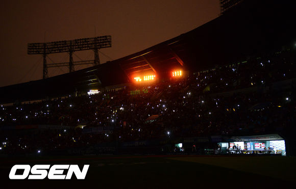 30일 오후 서울 잠실구장에서 열린 '2013 한국야쿠르트 세븐 프로야구' 두산 베어스와 KIA 타이거즈의 경기 5회말 크리닝 타임, 잠실구장이 정전이돼 경기가 중단되고 있다.