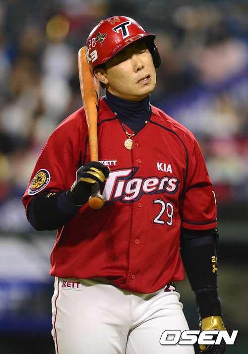 30일 오후 서울 잠실구장에서 열린 '2013 한국야쿠르트 세븐 프로야구' 두산 베어스와 KIA 타이거즈의 경기 8회초 무사 3루 나지완이 포수 스트라이크 낫 아웃으로 물러나자 아쉬워하고 있다.