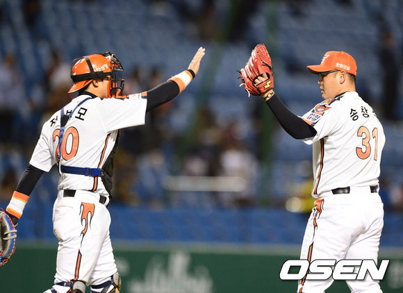 경기 종료후 송창식과 정범모가 승리의 하이파이브를 하고 있다./ ajyoung@osen.co.kr