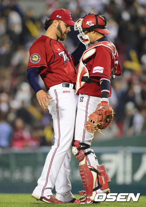 30일 오후 서울 잠실구장에서 열린 '2013 한국야쿠르트 세븐 프로야구' 두산 베어스와 KIA 타이거즈의 경기 종료 후 앤서니와 이성우가 세리머니를 하고 있다.