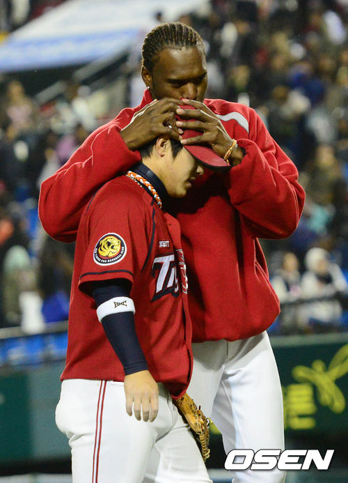 30일 오후 서울 잠실구장에서 열린 '2013 한국야쿠르트 세븐 프로야구' 두산 베어스와 KIA 타이거즈의 경기 종료 후 소사가 김선빈 모자에 입맞춤을 하고 있다.