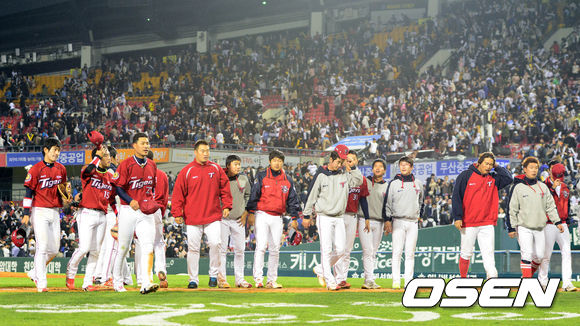 30일 오후 서울 잠실구장에서 열린 '2013 한국야쿠르트 세븐 프로야구' 두산 베어스와 KIA 타이거즈의 경기 종료 후 KIA 선수들이 관중에게 인사를 하고 있다.