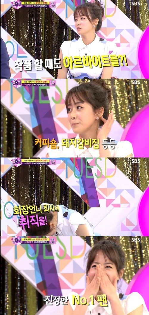 그는 "23~24살때 연기자 활동을 하고 있었음에도 돈이 없어서 커피숍이나 돼지갈비집에서 일을 했다. 정말 특이한 아르바이트를 한 적이 있는데 팬클럽 회장 언니의 회사에 취직했던 일이다"라고 말했다.