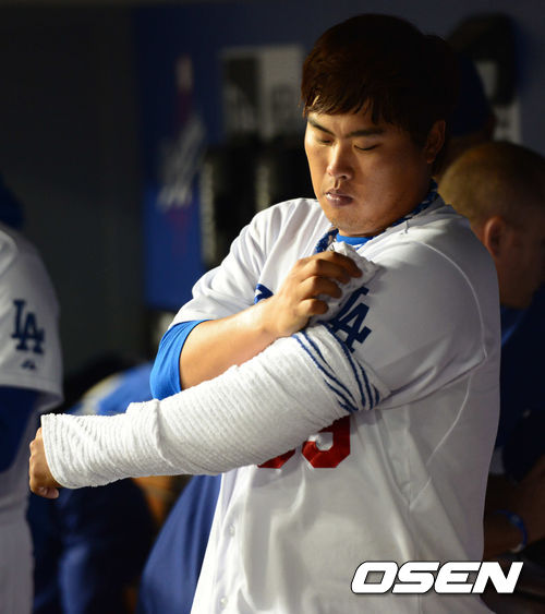 1일(이하 한국시간) 미국 캘리포니아 로스앤젤레스 다저스타디움에서 열리는 LA 다저스와 콜로라도 로키스의 경기 류현진이 덕아웃에서 팔에 타월을 감고 있다.