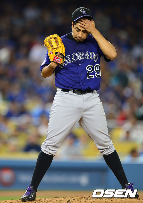 1일(이하 한국시간) 미국 캘리포니아 로스앤젤레스 다저스타디움에서 열리는 LA 다저스와 콜로라도 로키스의 경기 2회 현재까지 4실점한 로키스 선발 호르헤 델라로사가 땀을 닦고 있다.