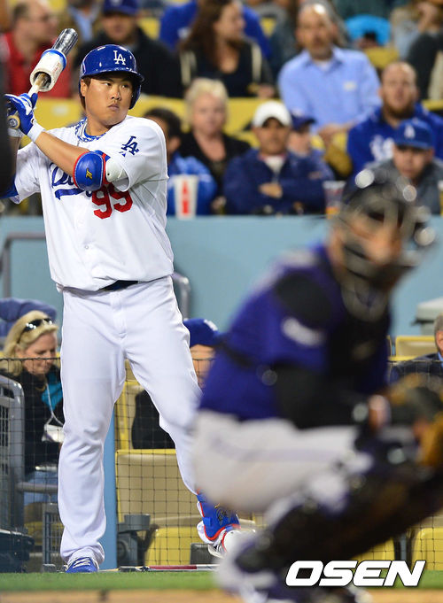1일(이하 한국시간) 미국 캘리포니아 로스앤젤레스 다저스타디움에서 열리는 LA 다저스와 콜로라도 로키스의 경기 LA 다저스 류현진이 타석으로 나오며 스윙을 하고 있다.