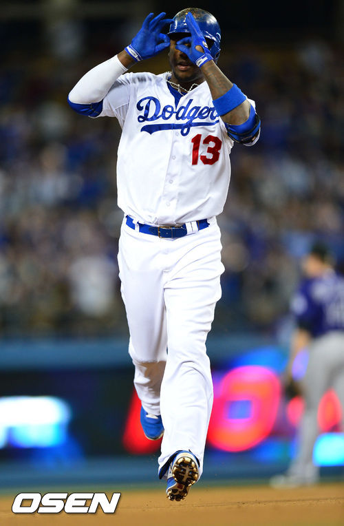 1일(이하 한국시간) 미국 캘리포니아 로스앤젤레스 다저스타디움에서 열리는 LA 다저스와 콜로라도 로키스의 경기 LA 다저스 핸리 라미레스가 3회말 1사 복귀 후 첫 홈런을 날린 관중석을 향해 'I See You' 세리머니를 펼치고 있다.