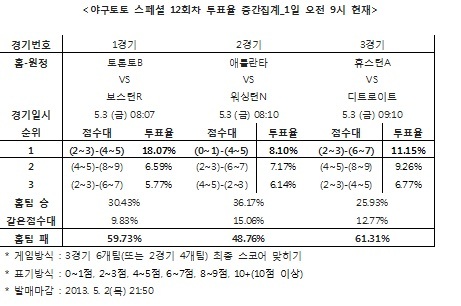 국민체육진흥공단(www.kspo.or.kr)이 발행하는 체육진흥투표권 수탁사업자인 스포츠토토의 공식 온라인 발매 사이트 베트맨(www.betman.co.kr)이 3일(금)에 열리는 미프로야구(MLB) 3경기를 대상으로 한 야구토토 스페셜 12회차 투표율을 중간 집계한 결과, 참가자의 59.73%는 토론토 블루제이스-보스턴 레드삭스(1경기)전에서 보스턴의 승리를 예상했다.