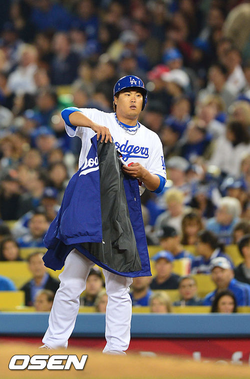 1일(이하 한국시간) 미국 캘리포니아 로스앤젤레스 다저스타디움에서 열리는 LA 다저스와 콜로라도 로키스의 경기 3회말 2사 주자 1,2루 LA 다저스 류현진이 우중간 1타점 적시타를 날린 후 1루에서 점퍼를 입고 있다.