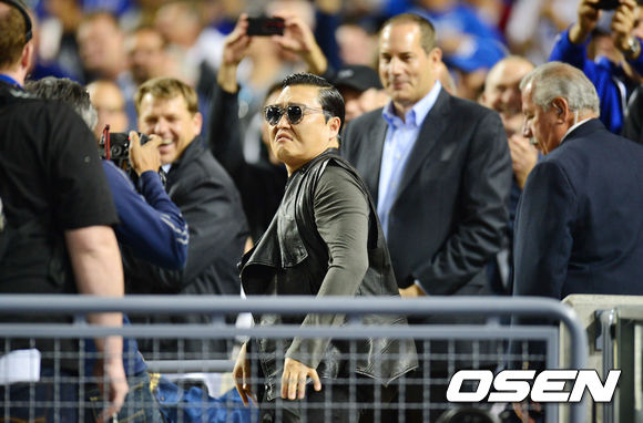 1일(이하 한국시간) 미국 캘리포니아 로스앤젤레스 다저스타디움에서 열리는 LA 다저스와 콜로라도 로키스의 경기에 싸이가 그라운드 위에서 젠틀맨 공연을 펼피고 있다.