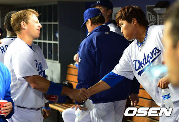 1일(이하 한국시간) 미국 캘리포니아 로스앤젤레스 다저스타디움에서 열리는 LA 다저스와 콜로라도 로키스의 경기에 6회를 마친 다저스 선발 류현진이 더그아웃으로 들어와 포수 A.J 엘리스와 인사를 나누고 있다.