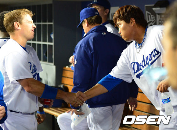1일(이하 한국시간) 미국 캘리포니아 로스앤젤레스 다저스타디움에서 열리는 LA 다저스와 콜로라도 로키스의 경기에 6회까지 투구를 마친 LA 다저스 선발 류현진이 A.J 엘리스의 축하를 받고 있다.