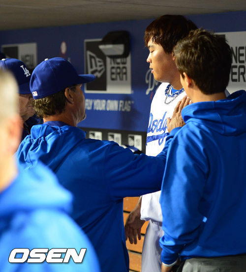 1일(이하 한국시간) 미국 캘리포니아 로스앤젤레스 다저스타디움에서 열리는 LA 다저스와 콜로라도 로키스의 경기 6회를 마치고 들어온 류현진에게 매팅리 감독이 격려를 하고 있다.