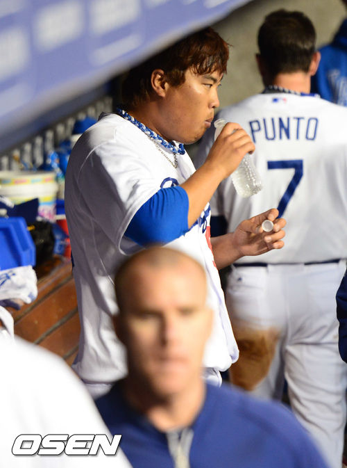 1일(이하 한국시간) 미국 캘리포니아 로스앤젤레스 다저스타디움에서 열리는 LA 다저스와 콜로라도 로키스의 경기 류현진이 덕아웃에서 물을 마시고 있다.