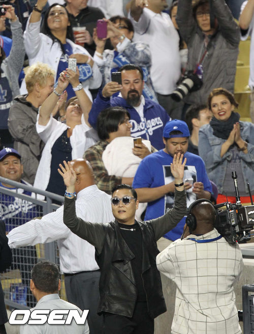 1일(이하 한국시간) 미국 캘리포니아 로스앤젤레스 다저스타디움에서 열리는 LA 다저스와 콜로라도 로키스의 경기 다저스타디움을 찾은 월드스타 싸이가 팬들에게 인사를 하고 있다.