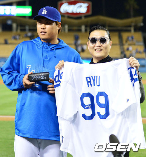 경기를 마치고 싸이와 류현진이 사인 선글라스와 사인 유니폼을 선물로 교환한 후 포토타임을 갖고 있다. / youngrae@osen.co.kr