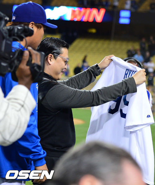 경기를 마치고 싸이가 류현진의 유니폼을 받으며 감격하고 있다. / dreamer@osen.co.kr