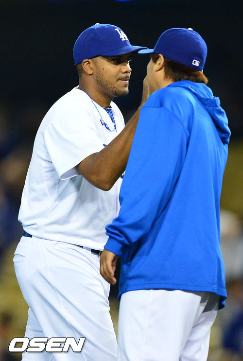 경기를 마치고 다저스 류현진이 마무리 켄리 잰슨과 하이파이브를 하고 있다./ youngrae@osen.co.kr