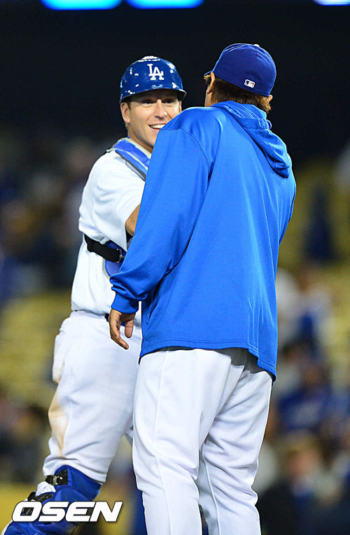 경기를 마치고 다저스 류현진과 A.J 엘리스가 하이파이브를 하고 있다./ youngrae@osen.co.kr