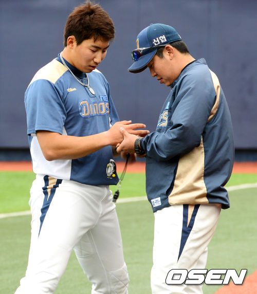 1일 오후 창원 마산구장에서 열리는 '2013 한국야쿠트르 세븐 프로야구' NC 다이노스와 LG 트윈스의 경기에 앞서 NC 나성범이 트레이너에 부상 부위를 보여주며 이야기를 나누고 있다. 지난 2월 오른쪽 손바닥 부상으로 1군 합류가 늦어진 나성범은 이날 1군 엔트리에 등록, 데뷔전을 앞두고 있다.