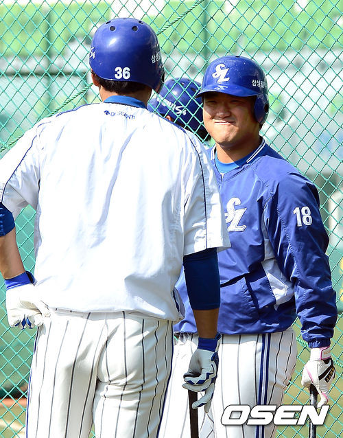 1일 오후 대구구장에서 열리는 '2013 한국야쿠르트 세븐 프로야구' 삼성 라이온즈와 넥센 히어로즈의 경기에 앞서 삼성 박성민이 이승엽과 이야기를 나누며 미소를 짓고 있다.
