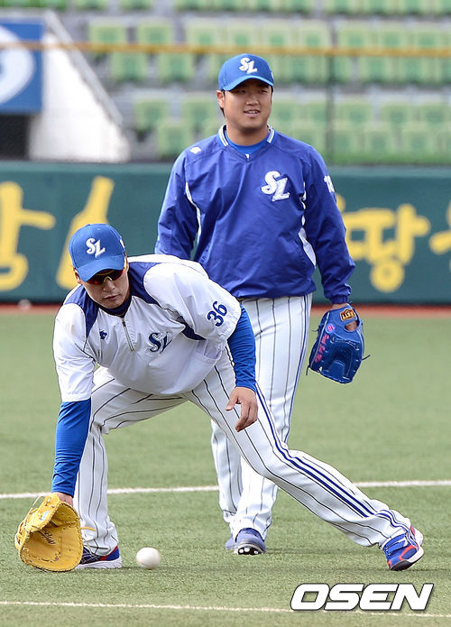 1일 오후 대구구장에서 열리는 '2013 한국야쿠르트 세븐 프로야구' 삼성 라이온즈와 넥센 히어로즈의 경기에 앞서 삼성 이승엽이 박석민과 3루 수비연습을 하고 있다.
