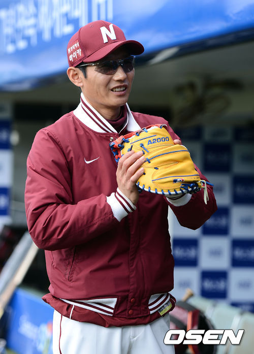 1일 오후 대구구장에서 열리는 '2013 한국야쿠르트 세븐 프로야구' 삼성 라이온즈와 넥센 히어로즈의 경기에 앞서 넥센 염경엽 감독이 1루수 미트를 낀채 선수들의 훈련을 바라보고 있다.