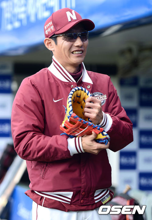 1일 오후 대구구장에서 열리는 '2013 한국야쿠르트 세븐 프로야구' 삼성 라이온즈와 넥센 히어로즈의 경기에 앞서 넥센 염경엽 감독이 박병호의 미트를 길들이고 있다.