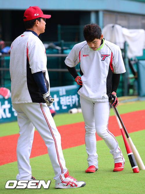 1일 오후 서울 잠실구장에서 열린 '2013 한국야쿠르트 세븐 프로야구' 두산 베어스와 KIA 타이거즈의 경기, 경기에 앞서 KIA 이용규가 김용달 코치와 이야기를 나누고 있다.