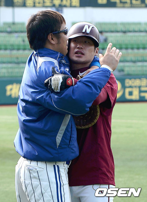 1일 오후 대구구장에서 열리는 '2013 한국야쿠르트 세븐 프로야구' 삼성 라이온즈와 넥센 히어로즈의 경기에 앞서 삼성 채태인과 넥센 장기영이 장난을 치고 있다.