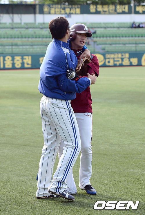 1일 오후 대구구장에서 열리는 '2013 한국야쿠르트 세븐 프로야구' 삼성 라이온즈와 넥센 히어로즈의 경기에 앞서 삼성 채태인과 넥센 장기영이 장난을 치고 있다.