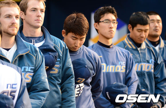 1일 오후 창원 마산구장에서 열린 '2013 한국야쿠트르 세븐 프로야구' NC 다이노스와 LG 트윈스의 경기, 경기에 앞서 1군에 합류한 NC 나성범이 국민의례를 하고 있다.
