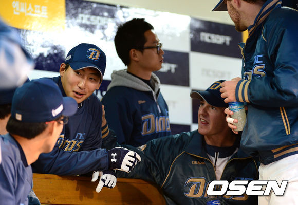 1일 오후 창원 마산구장에서 열린 '2013 한국야쿠트르 세븐 프로야구' NC 다이노스와 LG 트윈스의 경기, 경기에 앞서 1군에 합류한 NC 나성범이 더그아웃에서 동료선수들과 이야기를 나누고 있다.
