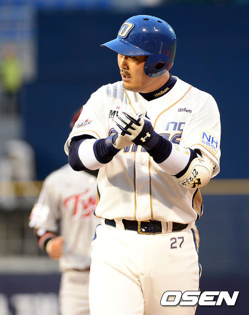 1일 오후 창원 마산구장에서 열린 '2013 한국야쿠트르 세븐 프로야구' NC 다이노스와 LG 트윈스의 경기, 1회말 2사 2루에서 NC 이호준이 선제 1타점 적시타를 날리고 박수를 치고 있다.