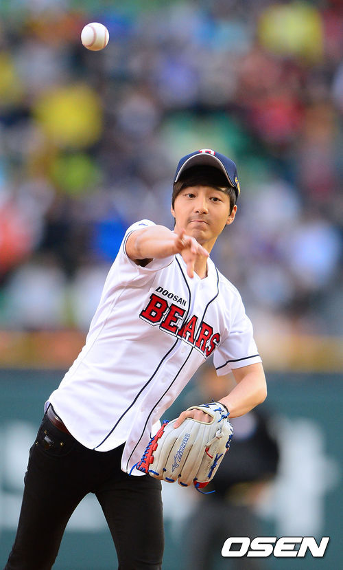 1일 오후 서울 잠실구장에서 열린 '2013 한국야쿠르트 세븐 프로야구' 두산 베어스와 KIA 타이거즈의 경기, 경기에 앞서 가수 로이킴이 시구를 하고 있다