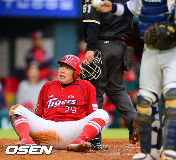 1일 오후 서울 잠실구장에서 열린 '2013 한국야쿠르트 세븐 프로야구' 두산 베어스와 KIA 타이거즈의 경기, 1회초 2사 만루 KIA 김상현의 1타점 적시타때 2루 주자 나지완이 홈에서 태그아웃된 후 아쉬워하고 있다