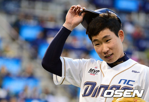 1일 오후 창원 마산구장에서 열린 '2013 한국야쿠트르 세븐 프로야구' NC 다이노스와 LG 트윈스의 경기, 1회초 수비를 마친 NC 이재학이 미소를 지으며 더그아웃으로 향하고 있다.
