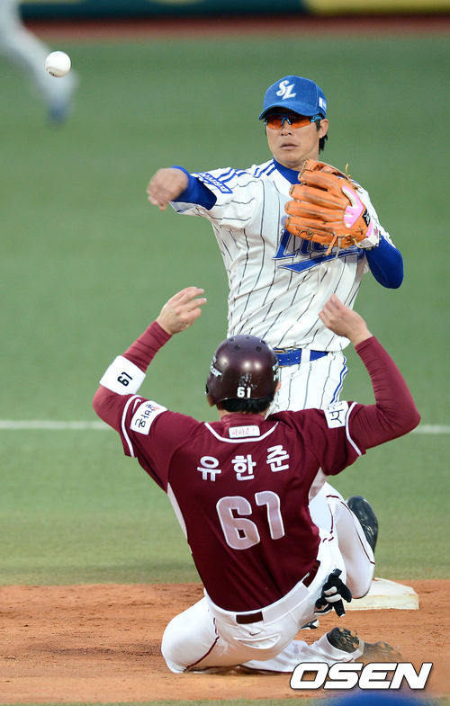 1일 오후 대구구장에서 열린 '2013 한국야쿠르트 세븐 프로야구' 삼성 라이온즈와 넥센 히어로즈의 경기 2회초 1사 1루 삼성 신명철이 넥센 박동원의 타구를 잡아 1루 주자 유한준을 포스아웃 시키고 1루로 송구하고 있다.