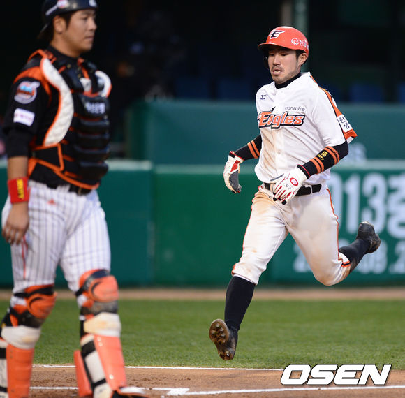 1일 오후 대전구장에서 열린 '2013 한국야쿠르트 세븐 프로야구' 한화 이글스와 롯데 자이언츠경기, 1회말 2사 2루 김태균의 적시타때 2루 주자 한상훈이 선취득점을 올리고 있다.