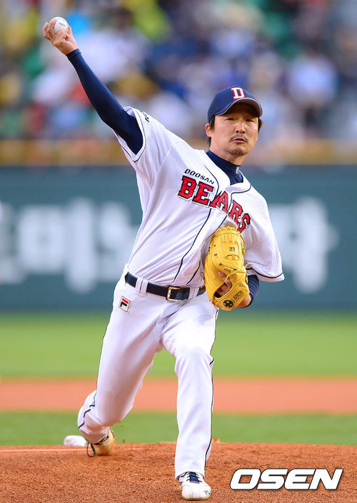 1일 오후 서울 잠실구장에서 열린 '2013 한국야쿠르트 세븐 프로야구' 두산 베어스와 KIA 타이거즈의 경기, 1회초 두산 선발투수 김상현이 역투하고 있다