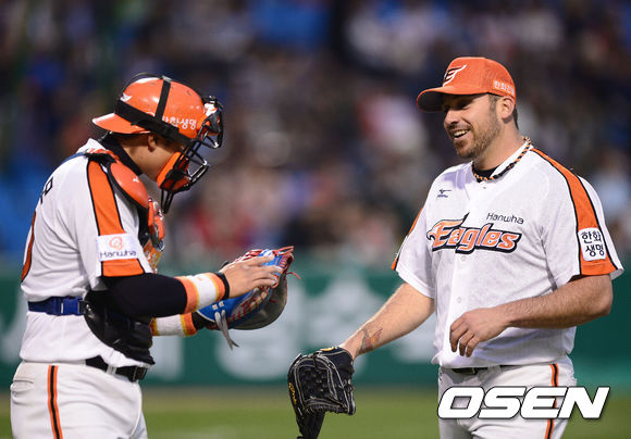 1일 오후 대전구장에서 열린 '2013 한국야쿠르트 세븐 프로야구' 한화 이글스와 롯데 자이언츠경기, 2회초 2사 3루 실점위기를 넘긴 한화선발 이브랜드가 수비를 마치고 정범모 포수와 이야기를 나누며 덕아웃을 향하고 있다.
