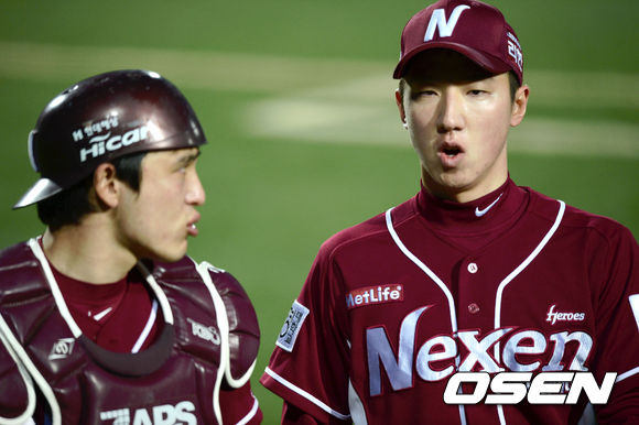 1일 오후 대구구장에서 열린 '2013 한국야쿠르트 세븐 프로야구' 삼성 라이온즈와 넥센 히어로즈의 경기 3회말 넥센 강윤구가 이닝을 무실점으로 막아낸 뒤 더그아웃으로 들어오면서 박동원과 이야기를 나누고 있다.