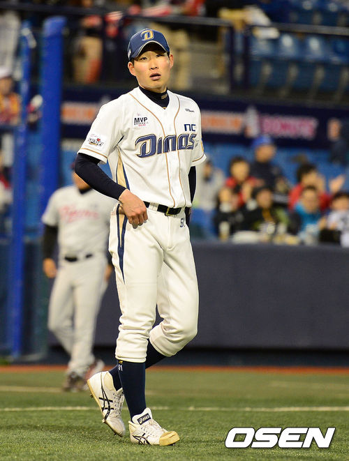 1일 오후 창원 마산구장에서 열린 '2013 한국야쿠트르 세븐 프로야구' NC 다이노스와 LG 트윈스의 경기, 3회초 2사 1,2루에서 NC 이재학이 LG 이진영의 중견수 플라이 타구가 안타가 되며 역전을 허용하자 아쉬워하고 있다.