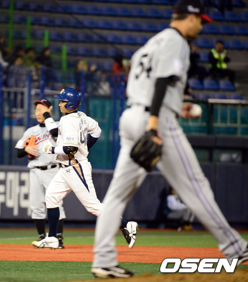 1일 오후 창원 마산구장에서 열린 '2013 한국야쿠트르 세븐 프로야구' NC 다이노스와 LG 트윈스의 경기, 4회말 2사 2,3루에서 NC 김태군이 역전 스리런포를 날리고 그라운드를 돌고 있다.